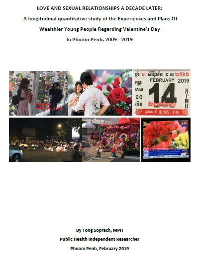 This study seeks to answer the research question: “What plans do wealthier young people in Phnom Penh have for sexual activity on the upcoming Valentine’s Day?” This study follows up on 2 quantitative studies conducted in 2009 and 2014, using a cross-sectional survey design with cluster sampling to survey wealthier young people aged 15-24 years old in Phnom Penh (N=1176) broken down by gender in four categories, with 502 males (42.7{5e4ee91c08cb3c7f146c4aae02e529f146f15280100a09ade5af78d570d7fd3d}) and 674 females (57.3{5e4ee91c08cb3c7f146c4aae02e529f146f15280100a09ade5af78d570d7fd3d}).